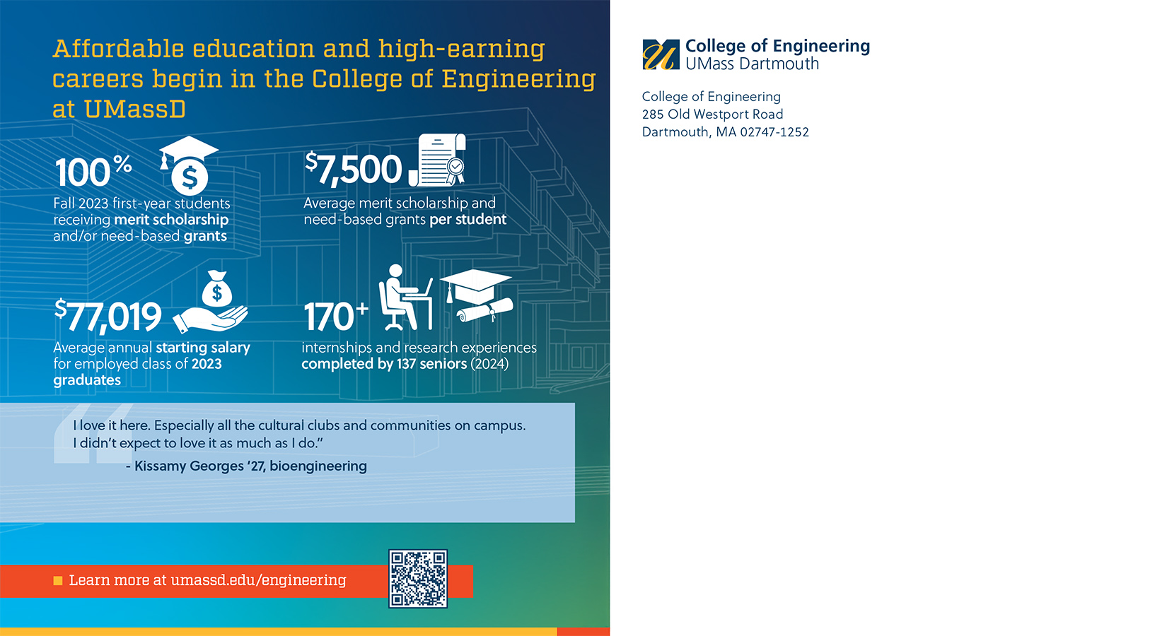 I was asked to edit this postcard with current information and data, to entice and welcome incoming students who are considering the College of Engineering as the home of their Major. The postcard features various facts about The College of Engineering's students and their success information. This data will help students understand that enrolling in one of the Majors under this College's umbrella will lead them to a succesful future.